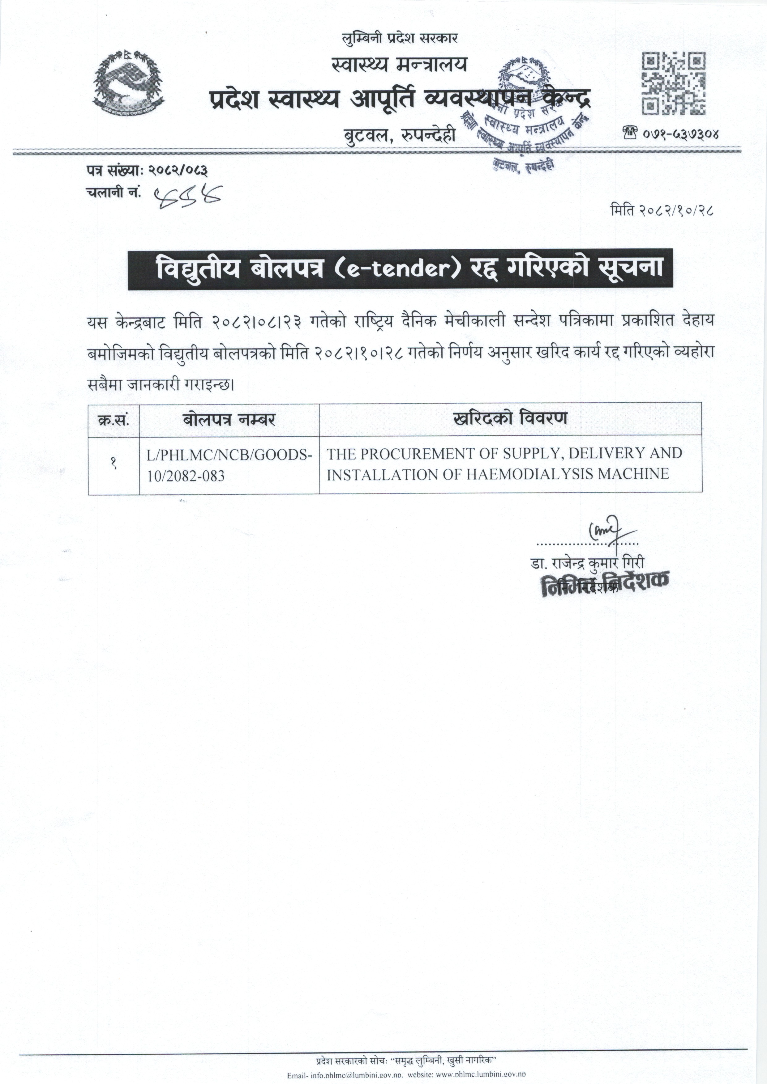 विद्युतीय बोलपत्र (e-tender) रद्द गरिएको सूचना